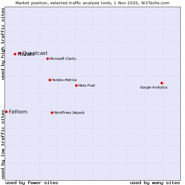 TechnologiesContent ManagementServer-side Languages Client-side Languages JavaScript Libraries CSS Frameworks Web Servers Web Panels Operating Systems Web Hosting Data Centers Reverse Proxies DNS Servers Email Servers SSL Certificate Authorities Content Delivery Traffic Analysis Tools Advertising Networks Tag Managers Social Widgets Site Elements Structured Data Markup Languages Character Encodings Image File Formats Top Level Domains Server Locations Content Languages | Technologies > Traffic Analysis Tools > Technology usage comparison Comparison of the usage statistics of Quantcast vs. Histats vs. Fathom for websitesThis report shows the usage statistics of Quantcast vs. Histats vs. Fathom as traffic analysis tool on the web. See technologies overview for explanations on the methodologies used in the surveys. Our reports are updated daily. Usage and market shareThis diagram shows the percentages of websites using the selected technologies. How to read the diagram: