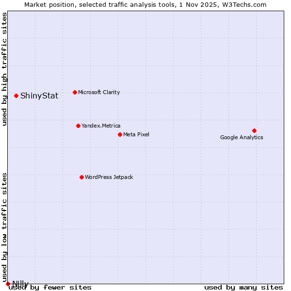 TechnologiesContent ManagementServer-side Languages Client-side Languages JavaScript Libraries CSS Frameworks Web Servers Web Panels Operating Systems Web Hosting Data Centers Reverse Proxies DNS Servers Email Servers SSL Certificate Authorities Content Delivery Traffic Analysis Tools Advertising Networks Tag Managers Social Widgets Site Elements Structured Data Markup Languages Character Encodings Image File Formats Top Level Domains Server Locations Content Languages ComparisonCompare with other | Technologies > Traffic Analysis Tools > Technology usage comparison Comparison of the usage statistics of ShinyStat vs. Nilly for websitesThis report shows the usage statistics of ShinyStat vs. Nilly as traffic analysis tool on the web. See technologies overview for explanations on the methodologies used in the surveys. Our reports are updated daily. Usage and market shareThis diagram shows the percentages of websites using the selected technologies. How to read the diagram: