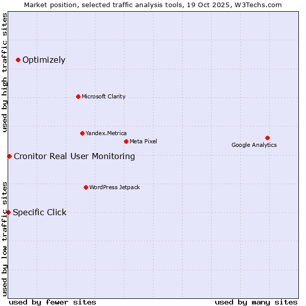 TechnologiesContent ManagementServer-side Languages Client-side Languages JavaScript Libraries CSS Frameworks Web Servers Web Panels Operating Systems Web Hosting Data Centers Reverse Proxies DNS Servers Email Servers SSL Certificate Authorities Content Delivery Traffic Analysis Tools Advertising Networks Tag Managers Social Widgets Site Elements Structured Data Markup Languages Character Encodings Image File Formats Top Level Domains Server Locations Content Languages | Technologies > Traffic Analysis Tools > Technology usage comparison Comparison of the usage statistics of Optimizely vs. Cronitor Real User Monitoring vs. Specific Click for websitesThis report shows the usage statistics of Optimizely vs. Cronitor Real User Monitoring vs. Specific Click as traffic analysis tool on the web. See technologies overview for explanations on the methodologies used in the surveys. Our reports are updated daily. Usage and market shareThis diagram shows the percentages of websites using the selected technologies. How to read the diagram: