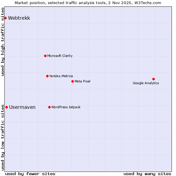 TechnologiesContent ManagementServer-side Languages Client-side Languages JavaScript Libraries CSS Frameworks Web Servers Web Panels Operating Systems Web Hosting Data Centers Reverse Proxies DNS Servers Email Servers SSL Certificate Authorities Content Delivery Traffic Analysis Tools Advertising Networks Tag Managers Social Widgets Site Elements Structured Data Markup Languages Character Encodings Image File Formats Top Level Domains Server Locations Content Languages ComparisonCompare with other | Technologies > Traffic Analysis Tools > Technology usage comparison Comparison of the usage statistics of Usermaven vs. Webtrekk for websitesThis report shows the usage statistics of Usermaven vs. Webtrekk as traffic analysis tool on the web. See technologies overview for explanations on the methodologies used in the surveys. Our reports are updated daily. Usage and market shareThis diagram shows the percentages of websites using the selected technologies. How to read the diagram: