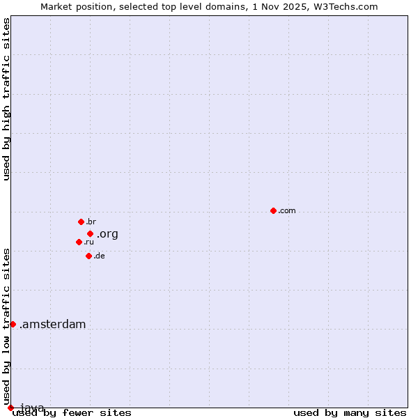 TechnologiesContent ManagementServer-side Languages Client-side Languages JavaScript Libraries CSS Frameworks Web Servers Web Panels Operating Systems Web Hosting Data Centers Reverse Proxies DNS Servers Email Servers SSL Certificate Authorities Content Delivery Traffic Analysis Tools Advertising Networks Tag Managers Social Widgets Site Elements Structured Data Markup Languages Character Encodings Image File Formats Top Level Domains Server Locations Content Languages | Technologies > Top Level Domains > Technology usage comparison Comparison of the usage statistics of .org (Organizations) vs. .amsterdam (City of Amsterdam, Netherlands) vs. .java (Java programming language) for websitesThis report shows the usage statistics of .org (Organizations) vs. .amsterdam (City of Amsterdam, Netherlands) vs. .java (Java programming language) as top level domain on the web. See technologies overview for explanations on the methodologies used in the surveys. Our reports are updated daily. UsageThis diagram shows the percentages of websites using the selected technologies. How to read the diagram: