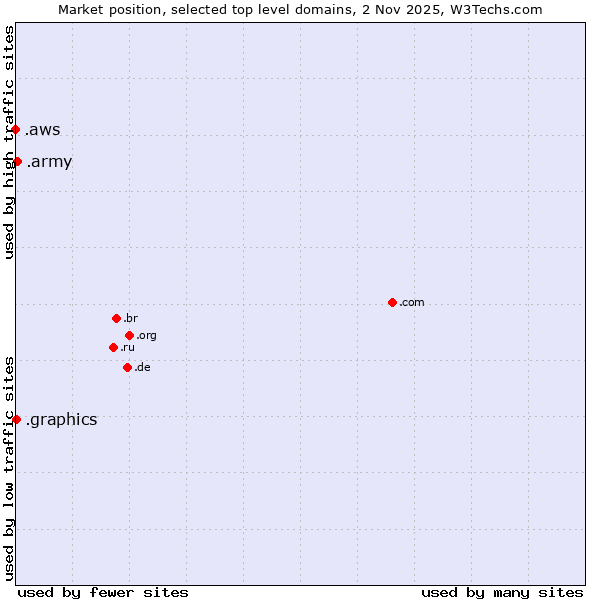 TechnologiesContent ManagementServer-side Languages Client-side Languages JavaScript Libraries CSS Frameworks Web Servers Web Panels Operating Systems Web Hosting Data Centers Reverse Proxies DNS Servers Email Servers SSL Certificate Authorities Content Delivery Traffic Analysis Tools Advertising Networks Tag Managers Social Widgets Site Elements Structured Data Markup Languages Character Encodings Image File Formats Top Level Domains Server Locations Content Languages | Technologies > Top Level Domains > Technology usage comparison Comparison of the usage statistics of .army (Army) vs. .graphics (Graphics) vs. .aws (Amazon Web Services brand) for websitesThis report shows the usage statistics of .army (Army) vs. .graphics (Graphics) vs. .aws (Amazon Web Services brand) as top level domain on the web. See technologies overview for explanations on the methodologies used in the surveys. Our reports are updated daily. UsageThis diagram shows the percentages of websites using the selected technologies. How to read the diagram: