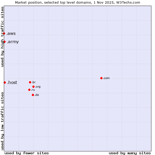 TechnologiesContent ManagementServer-side Languages Client-side Languages JavaScript Libraries CSS Frameworks Web Servers Web Panels Operating Systems Web Hosting Data Centers Reverse Proxies DNS Servers Email Servers SSL Certificate Authorities Content Delivery Traffic Analysis Tools Advertising Networks Tag Managers Social Widgets Site Elements Structured Data Markup Languages Character Encodings Image File Formats Top Level Domains Server Locations Content Languages | Technologies > Top Level Domains > Technology usage comparison Comparison of the usage statistics of .host (Hosting industry) vs. .army (Army) vs. .aws (Amazon Web Services brand) for websitesThis report shows the usage statistics of .host (Hosting industry) vs. .army (Army) vs. .aws (Amazon Web Services brand) as top level domain on the web. See technologies overview for explanations on the methodologies used in the surveys. Our reports are updated daily. UsageThis diagram shows the percentages of websites using the selected technologies. How to read the diagram: