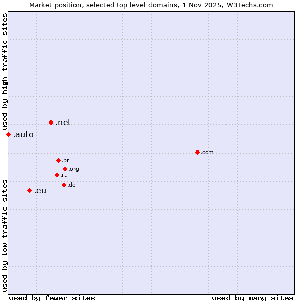 TechnologiesContent ManagementServer-side Languages Client-side Languages JavaScript Libraries CSS Frameworks Web Servers Web Panels Operating Systems Web Hosting Data Centers Reverse Proxies DNS Servers Email Servers SSL Certificate Authorities Content Delivery Traffic Analysis Tools Advertising Networks Tag Managers Social Widgets Site Elements Structured Data Markup Languages Character Encodings Image File Formats Top Level Domains Server Locations Content Languages | Technologies > Top Level Domains > Technology usage comparison Comparison of the usage statistics of .net (Network providers) vs. .eu (European Union) vs. .auto (Auto) for websitesThis report shows the usage statistics of .net (Network providers) vs. .eu (European Union) vs. .auto (Auto) as top level domain on the web. See technologies overview for explanations on the methodologies used in the surveys. Our reports are updated daily. UsageThis diagram shows the percentages of websites using the selected technologies. How to read the diagram: