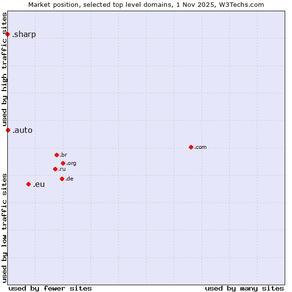 TechnologiesContent ManagementServer-side Languages Client-side Languages JavaScript Libraries CSS Frameworks Web Servers Web Panels Operating Systems Web Hosting Data Centers Reverse Proxies DNS Servers Email Servers SSL Certificate Authorities Content Delivery Traffic Analysis Tools Advertising Networks Tag Managers Social Widgets Site Elements Structured Data Markup Languages Character Encodings Image File Formats Top Level Domains Server Locations Content Languages | Technologies > Top Level Domains > Technology usage comparison Comparison of the usage statistics of .eu (European Union) vs. .auto (Auto) vs. .sharp (Sharp brand) for websitesThis report shows the usage statistics of .eu (European Union) vs. .auto (Auto) vs. .sharp (Sharp brand) as top level domain on the web. See technologies overview for explanations on the methodologies used in the surveys. Our reports are updated daily. UsageThis diagram shows the percentages of websites using the selected technologies. How to read the diagram: