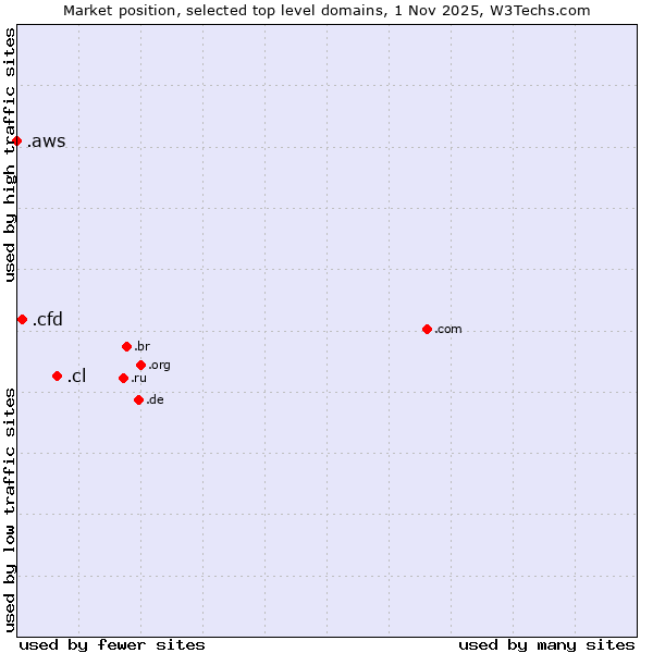 TechnologiesContent ManagementServer-side Languages Client-side Languages JavaScript Libraries CSS Frameworks Web Servers Web Panels Operating Systems Web Hosting Data Centers Reverse Proxies DNS Servers Email Servers SSL Certificate Authorities Content Delivery Traffic Analysis Tools Advertising Networks Tag Managers Social Widgets Site Elements Structured Data Markup Languages Character Encodings Image File Formats Top Level Domains Server Locations Content Languages | Technologies > Top Level Domains > Technology usage comparison Comparison of the usage statistics of .cl (Chile) vs. .cfd (Contract for difference (CFD) trading) vs. .aws (Amazon Web Services brand) for websitesThis report shows the usage statistics of .cl (Chile) vs. .cfd (Contract for difference (CFD) trading) vs. .aws (Amazon Web Services brand) as top level domain on the web. See technologies overview for explanations on the methodologies used in the surveys. Our reports are updated daily. UsageThis diagram shows the percentages of websites using the selected technologies. How to read the diagram: