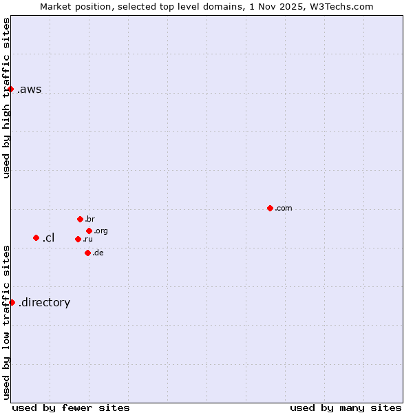 TechnologiesContent ManagementServer-side Languages Client-side Languages JavaScript Libraries CSS Frameworks Web Servers Web Panels Operating Systems Web Hosting Data Centers Reverse Proxies DNS Servers Email Servers SSL Certificate Authorities Content Delivery Traffic Analysis Tools Advertising Networks Tag Managers Social Widgets Site Elements Structured Data Markup Languages Character Encodings Image File Formats Top Level Domains Server Locations Content Languages | Technologies > Top Level Domains > Technology usage comparison Comparison of the usage statistics of .cl (Chile) vs. .directory (Directory) vs. .aws (Amazon Web Services brand) for websitesThis report shows the usage statistics of .cl (Chile) vs. .directory (Directory) vs. .aws (Amazon Web Services brand) as top level domain on the web. See technologies overview for explanations on the methodologies used in the surveys. Our reports are updated daily. UsageThis diagram shows the percentages of websites using the selected technologies. How to read the diagram: