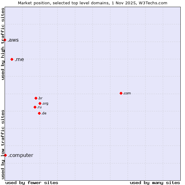 TechnologiesContent ManagementServer-side Languages Client-side Languages JavaScript Libraries CSS Frameworks Web Servers Web Panels Operating Systems Web Hosting Data Centers Reverse Proxies DNS Servers Email Servers SSL Certificate Authorities Content Delivery Traffic Analysis Tools Advertising Networks Tag Managers Social Widgets Site Elements Structured Data Markup Languages Character Encodings Image File Formats Top Level Domains Server Locations Content Languages | Technologies > Top Level Domains > Technology usage comparison Comparison of the usage statistics of .me (Montenegro) vs. .computer (Computer industry) vs. .aws (Amazon Web Services brand) for websitesThis report shows the usage statistics of .me (Montenegro) vs. .computer (Computer industry) vs. .aws (Amazon Web Services brand) as top level domain on the web. See technologies overview for explanations on the methodologies used in the surveys. Our reports are updated daily. UsageThis diagram shows the percentages of websites using the selected technologies. How to read the diagram: