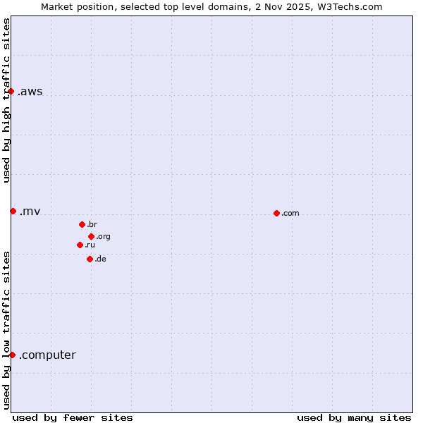 TechnologiesContent ManagementServer-side Languages Client-side Languages JavaScript Libraries CSS Frameworks Web Servers Web Panels Operating Systems Web Hosting Data Centers Reverse Proxies DNS Servers Email Servers SSL Certificate Authorities Content Delivery Traffic Analysis Tools Advertising Networks Tag Managers Social Widgets Site Elements Structured Data Markup Languages Character Encodings Image File Formats Top Level Domains Server Locations Content Languages | Technologies > Top Level Domains > Technology usage comparison Comparison of the usage statistics of .mv (Maldives) vs. .computer (Computer industry) vs. .aws (Amazon Web Services brand) for websitesThis report shows the usage statistics of .mv (Maldives) vs. .computer (Computer industry) vs. .aws (Amazon Web Services brand) as top level domain on the web. See technologies overview for explanations on the methodologies used in the surveys. Our reports are updated daily. UsageThis diagram shows the percentages of websites using the selected technologies. How to read the diagram: