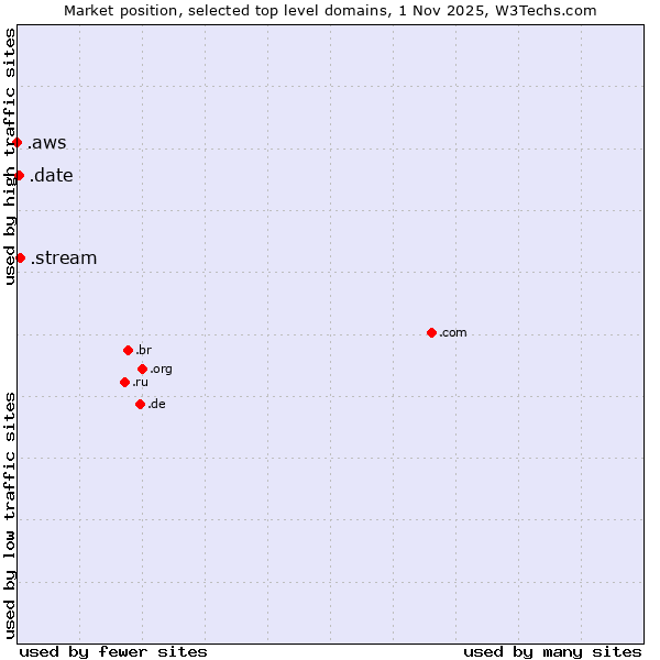 TechnologiesContent ManagementServer-side Languages Client-side Languages JavaScript Libraries CSS Frameworks Web Servers Web Panels Operating Systems Web Hosting Data Centers Reverse Proxies DNS Servers Email Servers SSL Certificate Authorities Content Delivery Traffic Analysis Tools Advertising Networks Tag Managers Social Widgets Site Elements Structured Data Markup Languages Character Encodings Image File Formats Top Level Domains Server Locations Content Languages | Technologies > Top Level Domains > Technology usage comparison Comparison of the usage statistics of .stream (Stream) vs. .date (Online dating industry) vs. .aws (Amazon Web Services brand) for websitesThis report shows the usage statistics of .stream (Stream) vs. .date (Online dating industry) vs. .aws (Amazon Web Services brand) as top level domain on the web. See technologies overview for explanations on the methodologies used in the surveys. Our reports are updated daily. UsageThis diagram shows the percentages of websites using the selected technologies. How to read the diagram: