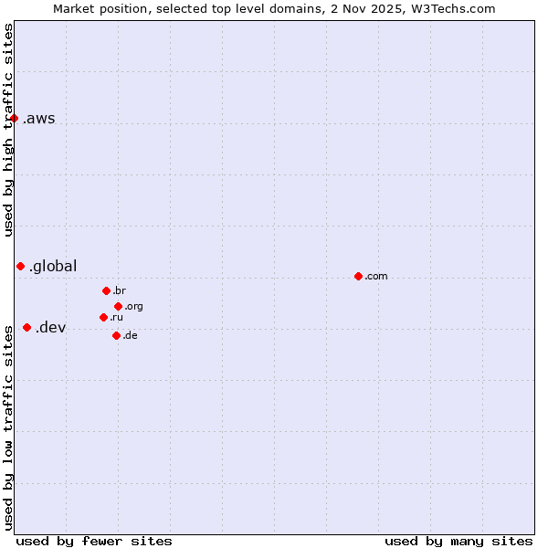 TechnologiesContent ManagementServer-side Languages Client-side Languages JavaScript Libraries CSS Frameworks Web Servers Web Panels Operating Systems Web Hosting Data Centers Reverse Proxies DNS Servers Email Servers SSL Certificate Authorities Content Delivery Traffic Analysis Tools Advertising Networks Tag Managers Social Widgets Site Elements Structured Data Markup Languages Character Encodings Image File Formats Top Level Domains Server Locations Content Languages | Technologies > Top Level Domains > Technology usage comparison Comparison of the usage statistics of .dev (Dev, projects in development) vs. .global (Global) vs. .aws (Amazon Web Services brand) for websitesThis report shows the usage statistics of .dev (Dev, projects in development) vs. .global (Global) vs. .aws (Amazon Web Services brand) as top level domain on the web. See technologies overview for explanations on the methodologies used in the surveys. Our reports are updated daily. UsageThis diagram shows the percentages of websites using the selected technologies. How to read the diagram: