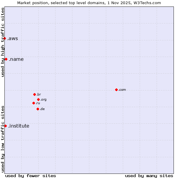 TechnologiesContent ManagementServer-side Languages Client-side Languages JavaScript Libraries CSS Frameworks Web Servers Web Panels Operating Systems Web Hosting Data Centers Reverse Proxies DNS Servers Email Servers SSL Certificate Authorities Content Delivery Traffic Analysis Tools Advertising Networks Tag Managers Social Widgets Site Elements Structured Data Markup Languages Character Encodings Image File Formats Top Level Domains Server Locations Content Languages | Technologies > Top Level Domains > Technology usage comparison Comparison of the usage statistics of .name (Individuals) vs. .institute (Institute) vs. .aws (Amazon Web Services brand) for websitesThis report shows the usage statistics of .name (Individuals) vs. .institute (Institute) vs. .aws (Amazon Web Services brand) as top level domain on the web. See technologies overview for explanations on the methodologies used in the surveys. Our reports are updated daily. UsageThis diagram shows the percentages of websites using the selected technologies. How to read the diagram: