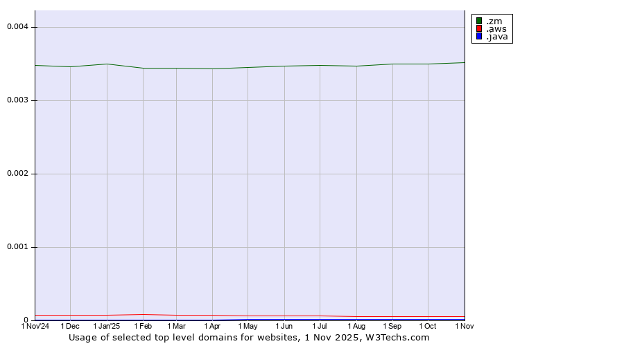 TechnologiesContent ManagementServer-side Languages Client-side Languages JavaScript Libraries CSS Frameworks Web Servers Web Panels Operating Systems Web Hosting Data Centers Reverse Proxies DNS Servers Email Servers SSL Certificate Authorities Content Delivery Traffic Analysis Tools Advertising Networks Tag Managers Social Widgets Site Elements Structured Data Markup Languages Character Encodings Image File Formats Top Level Domains Server Locations Content Languages | Technologies > Top Level Domains > Technology usage comparison Comparison of the usage statistics of .zm (Zambia) vs. .aws (Amazon Web Services brand) vs. .java (Java programming language) for websitesThis report shows the usage statistics of .zm (Zambia) vs. .aws (Amazon Web Services brand) vs. .java (Java programming language) as top level domain on the web. See technologies overview for explanations on the methodologies used in the surveys. Our reports are updated daily. UsageThis diagram shows the percentages of websites using the selected technologies. How to read the diagram: