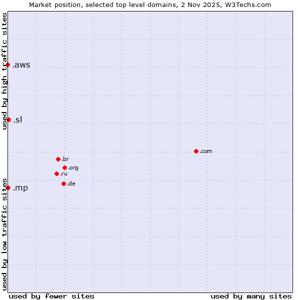 TechnologiesContent ManagementServer-side Languages Client-side Languages JavaScript Libraries CSS Frameworks Web Servers Web Panels Operating Systems Web Hosting Data Centers Reverse Proxies DNS Servers Email Servers SSL Certificate Authorities Content Delivery Traffic Analysis Tools Advertising Networks Tag Managers Social Widgets Site Elements Structured Data Markup Languages Character Encodings Image File Formats Top Level Domains Server Locations Content Languages | Technologies > Top Level Domains > Technology usage comparison Comparison of the usage statistics of .sl (Sierra Leone) vs. .mp (Northern Mariana Islands) vs. .aws (Amazon Web Services brand) for websitesThis report shows the usage statistics of .sl (Sierra Leone) vs. .mp (Northern Mariana Islands) vs. .aws (Amazon Web Services brand) as top level domain on the web. See technologies overview for explanations on the methodologies used in the surveys. Our reports are updated daily. UsageThis diagram shows the percentages of websites using the selected technologies. How to read the diagram: