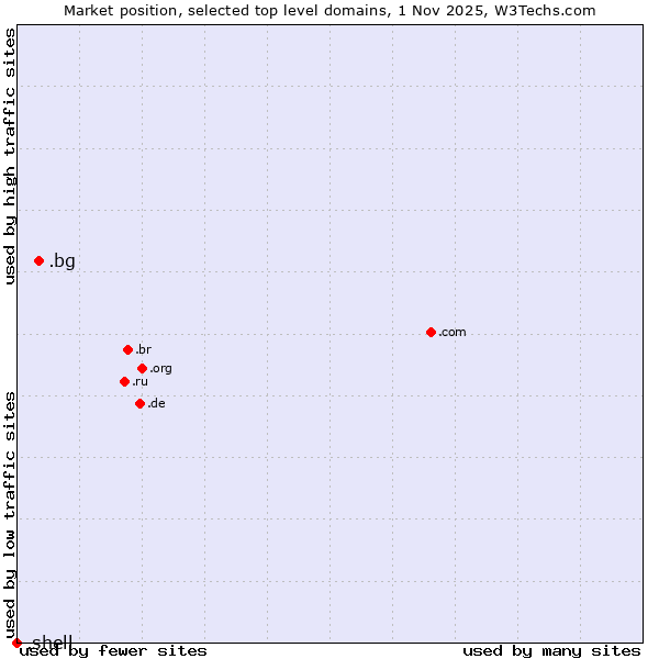 TechnologiesContent ManagementServer-side Languages Client-side Languages JavaScript Libraries CSS Frameworks Web Servers Web Panels Operating Systems Web Hosting Data Centers Reverse Proxies DNS Servers Email Servers SSL Certificate Authorities Content Delivery Traffic Analysis Tools Advertising Networks Tag Managers Social Widgets Site Elements Structured Data Markup Languages Character Encodings Image File Formats Top Level Domains Server Locations Content Languages ComparisonCompare with other | Technologies > Top Level Domains > Technology usage comparison Comparison of the usage statistics of .bg (Bulgaria) vs. .shell (Shell brand) for websitesThis report shows the usage statistics of .bg (Bulgaria) vs. .shell (Shell brand) as top level domain on the web. See technologies overview for explanations on the methodologies used in the surveys. Our reports are updated daily. UsageThis diagram shows the percentages of websites using the selected technologies. How to read the diagram: