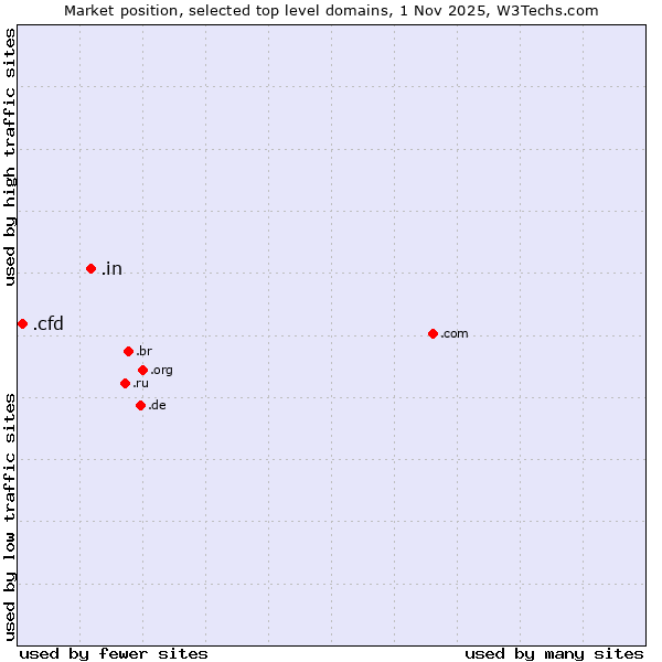 TechnologiesContent ManagementServer-side Languages Client-side Languages JavaScript Libraries CSS Frameworks Web Servers Web Panels Operating Systems Web Hosting Data Centers Reverse Proxies DNS Servers Email Servers SSL Certificate Authorities Content Delivery Traffic Analysis Tools Advertising Networks Tag Managers Social Widgets Site Elements Structured Data Markup Languages Character Encodings Image File Formats Top Level Domains Server Locations Content Languages ComparisonCompare with other | Technologies > Top Level Domains > Technology usage comparison Comparison of the usage statistics of .in (India) vs. .cfd (Contract for difference (CFD) trading) for websitesThis report shows the usage statistics of .in (India) vs. .cfd (Contract for difference (CFD) trading) as top level domain on the web. See technologies overview for explanations on the methodologies used in the surveys. Our reports are updated daily. UsageThis diagram shows the percentages of websites using the selected technologies. How to read the diagram: