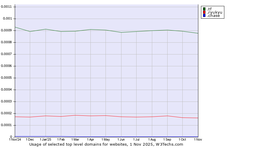 TechnologiesContent ManagementServer-side Languages Client-side Languages JavaScript Libraries CSS Frameworks Web Servers Web Panels Operating Systems Web Hosting Data Centers Reverse Proxies DNS Servers Email Servers SSL Certificate Authorities Content Delivery Traffic Analysis Tools Advertising Networks Tag Managers Social Widgets Site Elements Structured Data Markup Languages Character Encodings Image File Formats Top Level Domains Server Locations Content Languages | Technologies > Top Level Domains > Technology usage comparison Comparison of the usage statistics of .tf (French Southern Territories) vs. .ryukyu (Ryukyu, region of Okinawa, Japan) vs. .chase (JPMorgan Chase brand) for websitesThis report shows the usage statistics of .tf (French Southern Territories) vs. .ryukyu (Ryukyu, region of Okinawa, Japan) vs. .chase (JPMorgan Chase brand) as top level domain on the web. See technologies overview for explanations on the methodologies used in the surveys. Our reports are updated daily. UsageThis diagram shows the percentages of websites using the selected technologies. How to read the diagram: