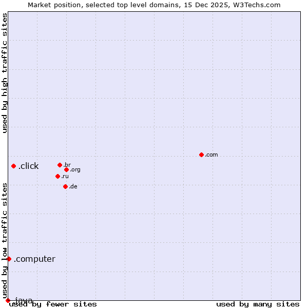 TechnologiesContent ManagementServer-side Languages Client-side Languages JavaScript Libraries CSS Frameworks Web Servers Web Panels Operating Systems Web Hosting Data Centers Reverse Proxies DNS Servers Email Servers SSL Certificate Authorities Content Delivery Traffic Analysis Tools Advertising Networks Tag Managers Social Widgets Site Elements Structured Data Markup Languages Character Encodings Image File Formats Top Level Domains Server Locations Content Languages | Technologies > Top Level Domains > Technology usage comparison Comparison of the usage statistics of .click (Click) vs. .computer (Computer industry) vs. .java (Java programming language) for websitesThis report shows the usage statistics of .click (Click) vs. .computer (Computer industry) vs. .java (Java programming language) as top level domain on the web. See technologies overview for explanations on the methodologies used in the surveys. Our reports are updated daily. UsageThis diagram shows the percentages of websites using the selected technologies. How to read the diagram: