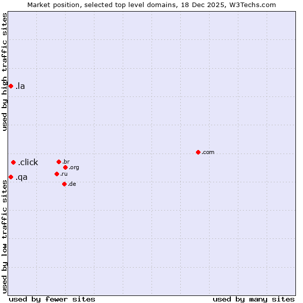 TechnologiesContent ManagementServer-side Languages Client-side Languages JavaScript Libraries CSS Frameworks Web Servers Web Panels Operating Systems Web Hosting Data Centers Reverse Proxies DNS Servers Email Servers SSL Certificate Authorities Content Delivery Traffic Analysis Tools Advertising Networks Tag Managers Social Widgets Site Elements Structured Data Markup Languages Character Encodings Image File Formats Top Level Domains Server Locations Content Languages | Technologies > Top Level Domains > Technology usage comparison Comparison of the usage statistics of .click (Click) vs. .la (Lao People's Democratic Republic) vs. .qa (Qatar) for websitesThis report shows the usage statistics of .click (Click) vs. .la (Lao People's Democratic Republic) vs. .qa (Qatar) as top level domain on the web. See technologies overview for explanations on the methodologies used in the surveys. Our reports are updated daily. UsageThis diagram shows the percentages of websites using the selected technologies. How to read the diagram: