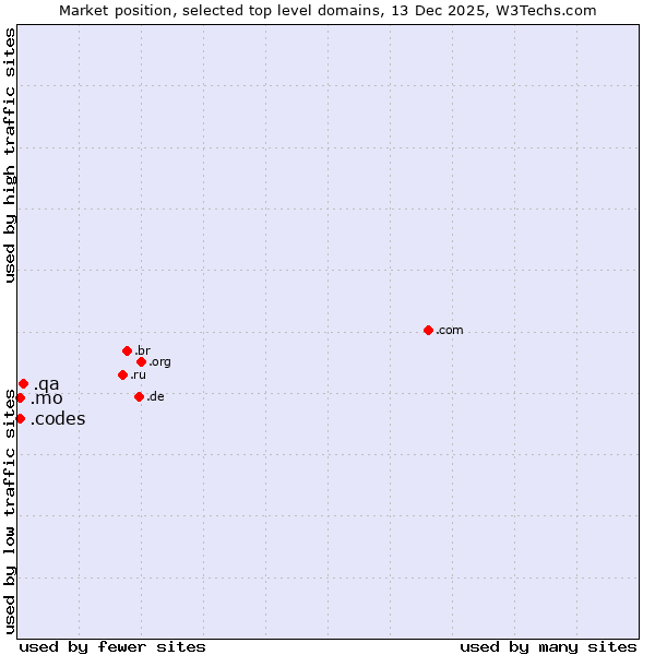 TechnologiesContent ManagementServer-side Languages Client-side Languages JavaScript Libraries CSS Frameworks Web Servers Web Panels Operating Systems Web Hosting Data Centers Reverse Proxies DNS Servers Email Servers SSL Certificate Authorities Content Delivery Traffic Analysis Tools Advertising Networks Tag Managers Social Widgets Site Elements Structured Data Markup Languages Character Encodings Image File Formats Top Level Domains Server Locations Content Languages | Technologies > Top Level Domains > Technology usage comparison Comparison of the usage statistics of .qa (Qatar) vs. .mo (Macao) vs. .codes (Codes) for websitesThis report shows the usage statistics of .qa (Qatar) vs. .mo (Macao) vs. .codes (Codes) as top level domain on the web. See technologies overview for explanations on the methodologies used in the surveys. Our reports are updated daily. UsageThis diagram shows the percentages of websites using the selected technologies. How to read the diagram: