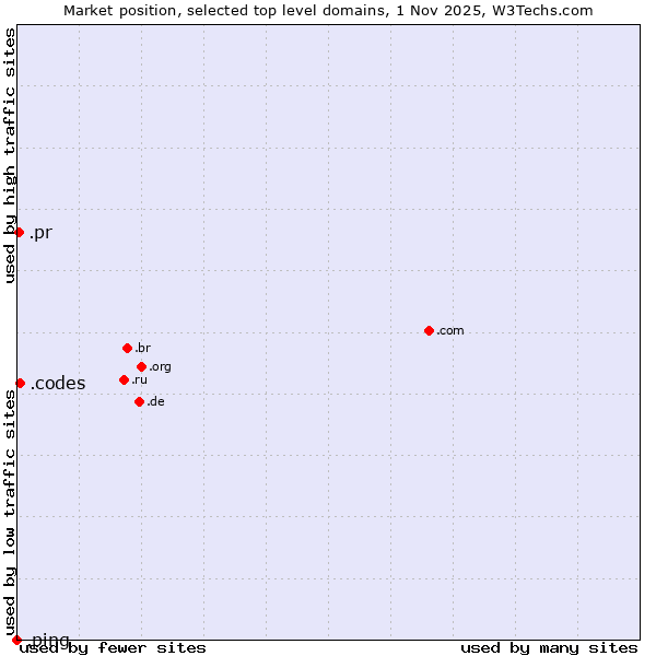 TechnologiesContent ManagementServer-side Languages Client-side Languages JavaScript Libraries CSS Frameworks Web Servers Web Panels Operating Systems Web Hosting Data Centers Reverse Proxies DNS Servers Email Servers SSL Certificate Authorities Content Delivery Traffic Analysis Tools Advertising Networks Tag Managers Social Widgets Site Elements Structured Data Markup Languages Character Encodings Image File Formats Top Level Domains Server Locations Content Languages | Technologies > Top Level Domains > Technology usage comparison Comparison of the usage statistics of .codes (Codes) vs. .pr (Puerto Rico) vs. .ping (Ping) for websitesThis report shows the usage statistics of .codes (Codes) vs. .pr (Puerto Rico) vs. .ping (Ping) as top level domain on the web. See technologies overview for explanations on the methodologies used in the surveys. Our reports are updated daily. UsageThis diagram shows the percentages of websites using the selected technologies. How to read the diagram: