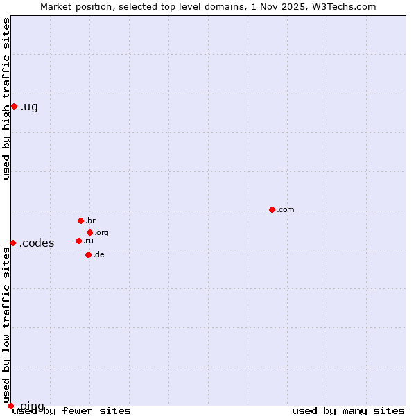 TechnologiesContent ManagementServer-side Languages Client-side Languages JavaScript Libraries CSS Frameworks Web Servers Web Panels Operating Systems Web Hosting Data Centers Reverse Proxies DNS Servers Email Servers SSL Certificate Authorities Content Delivery Traffic Analysis Tools Advertising Networks Tag Managers Social Widgets Site Elements Structured Data Markup Languages Character Encodings Image File Formats Top Level Domains Server Locations Content Languages | Technologies > Top Level Domains > Technology usage comparison Comparison of the usage statistics of .ug (Uganda) vs. .codes (Codes) vs. .ping (Ping) for websitesThis report shows the usage statistics of .ug (Uganda) vs. .codes (Codes) vs. .ping (Ping) as top level domain on the web. See technologies overview for explanations on the methodologies used in the surveys. Our reports are updated daily. UsageThis diagram shows the percentages of websites using the selected technologies. How to read the diagram:
