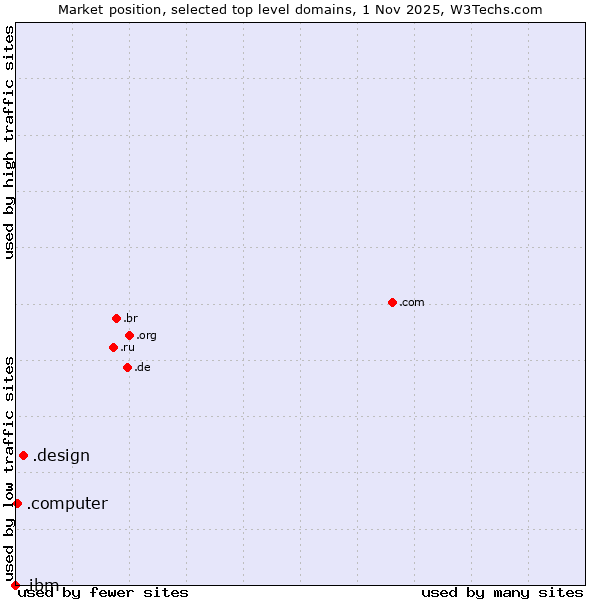 TechnologiesContent ManagementServer-side Languages Client-side Languages JavaScript Libraries CSS Frameworks Web Servers Web Panels Operating Systems Web Hosting Data Centers Reverse Proxies DNS Servers Email Servers SSL Certificate Authorities Content Delivery Traffic Analysis Tools Advertising Networks Tag Managers Social Widgets Site Elements Structured Data Markup Languages Character Encodings Image File Formats Top Level Domains Server Locations Content Languages | Technologies > Top Level Domains > Technology usage comparison Comparison of the usage statistics of .design (Design) vs. .computer (Computer industry) vs. .ibm (IBM brand) for websitesThis report shows the usage statistics of .design (Design) vs. .computer (Computer industry) vs. .ibm (IBM brand) as top level domain on the web. See technologies overview for explanations on the methodologies used in the surveys. Our reports are updated daily. UsageThis diagram shows the percentages of websites using the selected technologies. How to read the diagram: