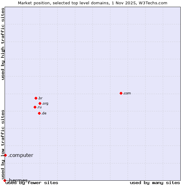 TechnologiesContent ManagementServer-side Languages Client-side Languages JavaScript Libraries CSS Frameworks Web Servers Web Panels Operating Systems Web Hosting Data Centers Reverse Proxies DNS Servers Email Servers SSL Certificate Authorities Content Delivery Traffic Analysis Tools Advertising Networks Tag Managers Social Widgets Site Elements Structured Data Markup Languages Character Encodings Image File Formats Top Level Domains Server Locations Content Languages ComparisonCompare with other | Technologies > Top Level Domains > Technology usage comparison Comparison of the usage statistics of .computer (Computer industry) vs. .hermes (Hermes brand) for websitesThis report shows the usage statistics of .computer (Computer industry) vs. .hermes (Hermes brand) as top level domain on the web. See technologies overview for explanations on the methodologies used in the surveys. Our reports are updated daily. UsageThis diagram shows the percentages of websites using the selected technologies. How to read the diagram: