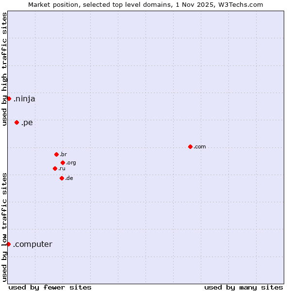 TechnologiesContent ManagementServer-side Languages Client-side Languages JavaScript Libraries CSS Frameworks Web Servers Web Panels Operating Systems Web Hosting Data Centers Reverse Proxies DNS Servers Email Servers SSL Certificate Authorities Content Delivery Traffic Analysis Tools Advertising Networks Tag Managers Social Widgets Site Elements Structured Data Markup Languages Character Encodings Image File Formats Top Level Domains Server Locations Content Languages | Technologies > Top Level Domains > Technology usage comparison Comparison of the usage statistics of .pe (Peru) vs. .ninja (Ninja) vs. .computer (Computer industry) for websitesThis report shows the usage statistics of .pe (Peru) vs. .ninja (Ninja) vs. .computer (Computer industry) as top level domain on the web. See technologies overview for explanations on the methodologies used in the surveys. Our reports are updated daily. UsageThis diagram shows the percentages of websites using the selected technologies. How to read the diagram: