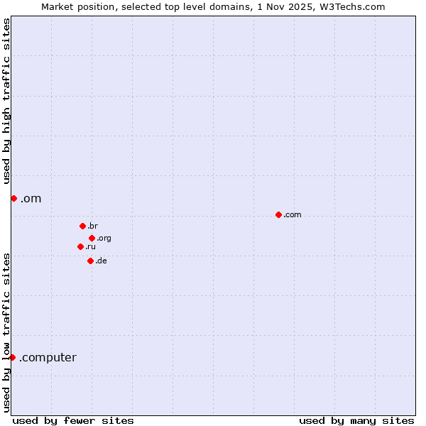 TechnologiesContent ManagementServer-side Languages Client-side Languages JavaScript Libraries CSS Frameworks Web Servers Web Panels Operating Systems Web Hosting Data Centers Reverse Proxies DNS Servers Email Servers SSL Certificate Authorities Content Delivery Traffic Analysis Tools Advertising Networks Tag Managers Social Widgets Site Elements Structured Data Markup Languages Character Encodings Image File Formats Top Level Domains Server Locations Content Languages ComparisonCompare with other | Technologies > Top Level Domains > Technology usage comparison Comparison of the usage statistics of .om (Oman) vs. .computer (Computer industry) for websitesThis report shows the usage statistics of .om (Oman) vs. .computer (Computer industry) as top level domain on the web. See technologies overview for explanations on the methodologies used in the surveys. Our reports are updated daily. UsageThis diagram shows the percentages of websites using the selected technologies. How to read the diagram: