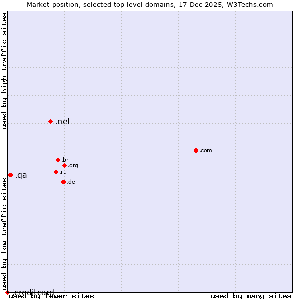 TechnologiesContent ManagementServer-side Languages Client-side Languages JavaScript Libraries CSS Frameworks Web Servers Web Panels Operating Systems Web Hosting Data Centers Reverse Proxies DNS Servers Email Servers SSL Certificate Authorities Content Delivery Traffic Analysis Tools Advertising Networks Tag Managers Social Widgets Site Elements Structured Data Markup Languages Character Encodings Image File Formats Top Level Domains Server Locations Content Languages | Technologies > Top Level Domains > Technology usage comparison Comparison of the usage statistics of .net (Network providers) vs. .qa (Qatar) vs. .creditcard (Credit card) for websitesThis report shows the usage statistics of .net (Network providers) vs. .qa (Qatar) vs. .creditcard (Credit card) as top level domain on the web. See technologies overview for explanations on the methodologies used in the surveys. Our reports are updated daily. UsageThis diagram shows the percentages of websites using the selected technologies. How to read the diagram: