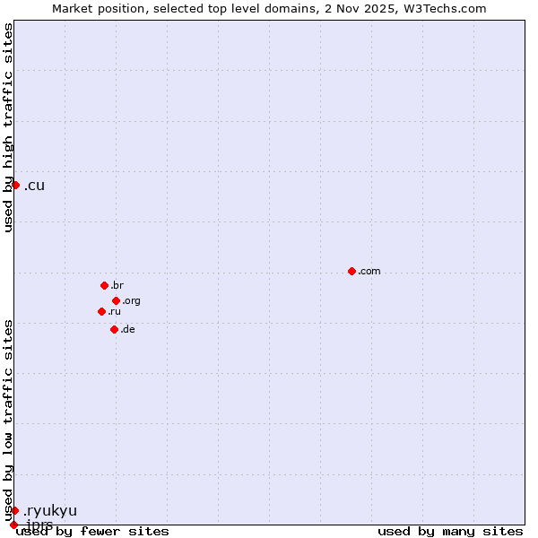 TechnologiesContent ManagementServer-side Languages Client-side Languages JavaScript Libraries CSS Frameworks Web Servers Web Panels Operating Systems Web Hosting Data Centers Reverse Proxies DNS Servers Email Servers SSL Certificate Authorities Content Delivery Traffic Analysis Tools Advertising Networks Tag Managers Social Widgets Site Elements Structured Data Markup Languages Character Encodings Image File Formats Top Level Domains Server Locations Content Languages | Technologies > Top Level Domains > Technology usage comparison Comparison of the usage statistics of .cu (Cuba) vs. .ryukyu (Ryukyu, region of Okinawa, Japan) vs. .jprs (Japan Registry Services brand) for websitesThis report shows the usage statistics of .cu (Cuba) vs. .ryukyu (Ryukyu, region of Okinawa, Japan) vs. .jprs (Japan Registry Services brand) as top level domain on the web. See technologies overview for explanations on the methodologies used in the surveys. Our reports are updated daily. UsageThis diagram shows the percentages of websites using the selected technologies. How to read the diagram: