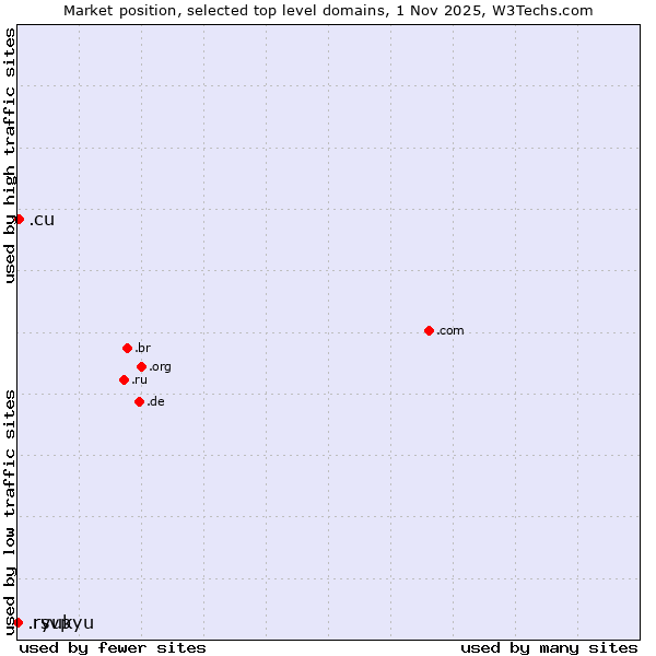 TechnologiesContent ManagementServer-side Languages Client-side Languages JavaScript Libraries CSS Frameworks Web Servers Web Panels Operating Systems Web Hosting Data Centers Reverse Proxies DNS Servers Email Servers SSL Certificate Authorities Content Delivery Traffic Analysis Tools Advertising Networks Tag Managers Social Widgets Site Elements Structured Data Markup Languages Character Encodings Image File Formats Top Level Domains Server Locations Content Languages | Technologies > Top Level Domains > Technology usage comparison Comparison of the usage statistics of .cu (Cuba) vs. .ryukyu (Ryukyu, region of Okinawa, Japan) vs. .rsvp (RSVP (French "répondez sʹil vous plaît", please reply)) for websitesThis report shows the usage statistics of .cu (Cuba) vs. .ryukyu (Ryukyu, region of Okinawa, Japan) vs. .rsvp (RSVP (French "répondez sʹil vous plaît", please reply)) as top level domain on the web. See technologies overview for explanations on the methodologies used in the surveys. Our reports are updated daily. UsageThis diagram shows the percentages of websites using the selected technologies. How to read the diagram: