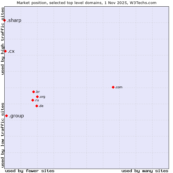 TechnologiesContent ManagementServer-side Languages Client-side Languages JavaScript Libraries CSS Frameworks Web Servers Web Panels Operating Systems Web Hosting Data Centers Reverse Proxies DNS Servers Email Servers SSL Certificate Authorities Content Delivery Traffic Analysis Tools Advertising Networks Tag Managers Social Widgets Site Elements Structured Data Markup Languages Character Encodings Image File Formats Top Level Domains Server Locations Content Languages | Technologies > Top Level Domains > Technology usage comparison Comparison of the usage statistics of .group (Group) vs. .cx (Christmas Island) vs. .sharp (Sharp brand) for websitesThis report shows the usage statistics of .group (Group) vs. .cx (Christmas Island) vs. .sharp (Sharp brand) as top level domain on the web. See technologies overview for explanations on the methodologies used in the surveys. Our reports are updated daily. UsageThis diagram shows the percentages of websites using the selected technologies. How to read the diagram: