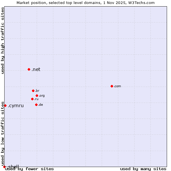 TechnologiesContent ManagementServer-side Languages Client-side Languages JavaScript Libraries CSS Frameworks Web Servers Web Panels Operating Systems Web Hosting Data Centers Reverse Proxies DNS Servers Email Servers SSL Certificate Authorities Content Delivery Traffic Analysis Tools Advertising Networks Tag Managers Social Widgets Site Elements Structured Data Markup Languages Character Encodings Image File Formats Top Level Domains Server Locations Content Languages | Technologies > Top Level Domains > Technology usage comparison Comparison of the usage statistics of .net (Network providers) vs. .cymru (Welsh linguistic and cultural community) vs. .shell (Shell brand) for websitesThis report shows the usage statistics of .net (Network providers) vs. .cymru (Welsh linguistic and cultural community) vs. .shell (Shell brand) as top level domain on the web. See technologies overview for explanations on the methodologies used in the surveys. Our reports are updated daily. UsageThis diagram shows the percentages of websites using the selected technologies. How to read the diagram: