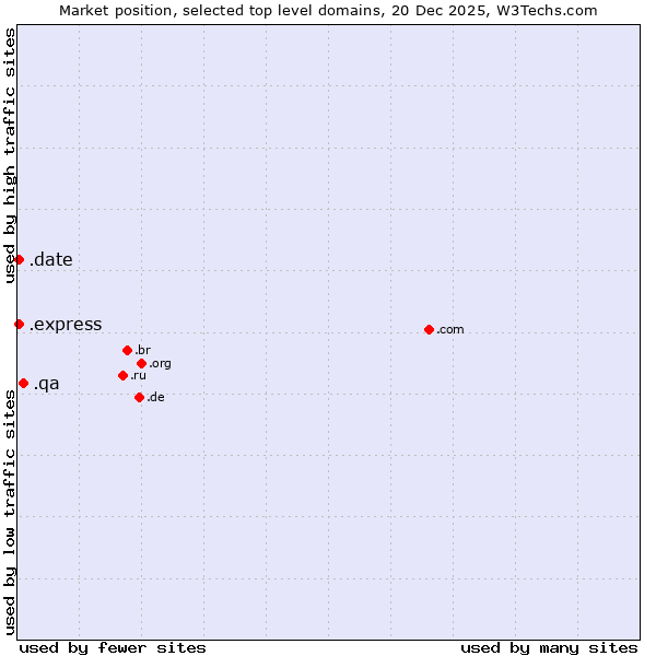 TechnologiesContent ManagementServer-side Languages Client-side Languages JavaScript Libraries CSS Frameworks Web Servers Web Panels Operating Systems Web Hosting Data Centers Reverse Proxies DNS Servers Email Servers SSL Certificate Authorities Content Delivery Traffic Analysis Tools Advertising Networks Tag Managers Social Widgets Site Elements Structured Data Markup Languages Character Encodings Image File Formats Top Level Domains Server Locations Content Languages | Technologies > Top Level Domains > Technology usage comparison Comparison of the usage statistics of .qa (Qatar) vs. .express (Express) vs. .date (Online dating industry) for websitesThis report shows the usage statistics of .qa (Qatar) vs. .express (Express) vs. .date (Online dating industry) as top level domain on the web. See technologies overview for explanations on the methodologies used in the surveys. Our reports are updated daily. UsageThis diagram shows the percentages of websites using the selected technologies. How to read the diagram: