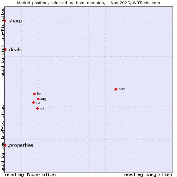 TechnologiesContent ManagementServer-side Languages Client-side Languages JavaScript Libraries CSS Frameworks Web Servers Web Panels Operating Systems Web Hosting Data Centers Reverse Proxies DNS Servers Email Servers SSL Certificate Authorities Content Delivery Traffic Analysis Tools Advertising Networks Tag Managers Social Widgets Site Elements Structured Data Markup Languages Character Encodings Image File Formats Top Level Domains Server Locations Content Languages | Technologies > Top Level Domains > Technology usage comparison Comparison of the usage statistics of .properties (Properties) vs. .deals (Deals) vs. .sharp (Sharp brand) for websitesThis report shows the usage statistics of .properties (Properties) vs. .deals (Deals) vs. .sharp (Sharp brand) as top level domain on the web. See technologies overview for explanations on the methodologies used in the surveys. Our reports are updated daily. UsageThis diagram shows the percentages of websites using the selected technologies. How to read the diagram: