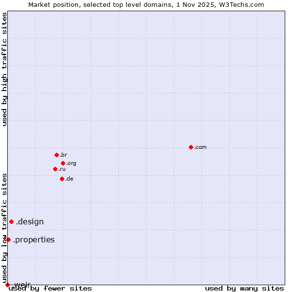 TechnologiesContent ManagementServer-side Languages Client-side Languages JavaScript Libraries CSS Frameworks Web Servers Web Panels Operating Systems Web Hosting Data Centers Reverse Proxies DNS Servers Email Servers SSL Certificate Authorities Content Delivery Traffic Analysis Tools Advertising Networks Tag Managers Social Widgets Site Elements Structured Data Markup Languages Character Encodings Image File Formats Top Level Domains Server Locations Content Languages | Technologies > Top Level Domains > Technology usage comparison Comparison of the usage statistics of .design (Design) vs. .properties (Properties) vs. .weir (Weir brand) for websitesThis report shows the usage statistics of .design (Design) vs. .properties (Properties) vs. .weir (Weir brand) as top level domain on the web. See technologies overview for explanations on the methodologies used in the surveys. Our reports are updated daily. UsageThis diagram shows the percentages of websites using the selected technologies. How to read the diagram: