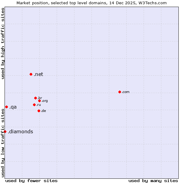 TechnologiesContent ManagementServer-side Languages Client-side Languages JavaScript Libraries CSS Frameworks Web Servers Web Panels Operating Systems Web Hosting Data Centers Reverse Proxies DNS Servers Email Servers SSL Certificate Authorities Content Delivery Traffic Analysis Tools Advertising Networks Tag Managers Social Widgets Site Elements Structured Data Markup Languages Character Encodings Image File Formats Top Level Domains Server Locations Content Languages | Technologies > Top Level Domains > Technology usage comparison Comparison of the usage statistics of .net (Network providers) vs. .qa (Qatar) vs. .diamonds (Jewelry industry) for websitesThis report shows the usage statistics of .net (Network providers) vs. .qa (Qatar) vs. .diamonds (Jewelry industry) as top level domain on the web. See technologies overview for explanations on the methodologies used in the surveys. Our reports are updated daily. UsageThis diagram shows the percentages of websites using the selected technologies. How to read the diagram: