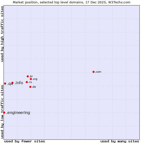 TechnologiesContent ManagementServer-side Languages Client-side Languages JavaScript Libraries CSS Frameworks Web Servers Web Panels Operating Systems Web Hosting Data Centers Reverse Proxies DNS Servers Email Servers SSL Certificate Authorities Content Delivery Traffic Analysis Tools Advertising Networks Tag Managers Social Widgets Site Elements Structured Data Markup Languages Character Encodings Image File Formats Top Level Domains Server Locations Content Languages | Technologies > Top Level Domains > Technology usage comparison Comparison of the usage statistics of .info (Information) vs. .qa (Qatar) vs. .engineering (Engineering) for websitesThis report shows the usage statistics of .info (Information) vs. .qa (Qatar) vs. .engineering (Engineering) as top level domain on the web. See technologies overview for explanations on the methodologies used in the surveys. Our reports are updated daily. UsageThis diagram shows the percentages of websites using the selected technologies. How to read the diagram: