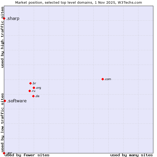 TechnologiesContent ManagementServer-side Languages Client-side Languages JavaScript Libraries CSS Frameworks Web Servers Web Panels Operating Systems Web Hosting Data Centers Reverse Proxies DNS Servers Email Servers SSL Certificate Authorities Content Delivery Traffic Analysis Tools Advertising Networks Tag Managers Social Widgets Site Elements Structured Data Markup Languages Character Encodings Image File Formats Top Level Domains Server Locations Content Languages | Technologies > Top Level Domains > Technology usage comparison Comparison of the usage statistics of .software (Software) vs. .sharp (Sharp brand) vs. .er (Eritrea) for websitesThis report shows the usage statistics of .software (Software) vs. .sharp (Sharp brand) vs. .er (Eritrea) as top level domain on the web. See technologies overview for explanations on the methodologies used in the surveys. Our reports are updated daily. UsageThis diagram shows the percentages of websites using the selected technologies. How to read the diagram: