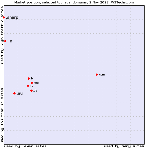 TechnologiesContent ManagementServer-side Languages Client-side Languages JavaScript Libraries CSS Frameworks Web Servers Web Panels Operating Systems Web Hosting Data Centers Reverse Proxies DNS Servers Email Servers SSL Certificate Authorities Content Delivery Traffic Analysis Tools Advertising Networks Tag Managers Social Widgets Site Elements Structured Data Markup Languages Character Encodings Image File Formats Top Level Domains Server Locations Content Languages | Technologies > Top Level Domains > Technology usage comparison Comparison of the usage statistics of .eu (European Union) vs. .la (Lao People's Democratic Republic) vs. .sharp (Sharp brand) for websitesThis report shows the usage statistics of .eu (European Union) vs. .la (Lao People's Democratic Republic) vs. .sharp (Sharp brand) as top level domain on the web. See technologies overview for explanations on the methodologies used in the surveys. Our reports are updated daily. UsageThis diagram shows the percentages of websites using the selected technologies. How to read the diagram:
