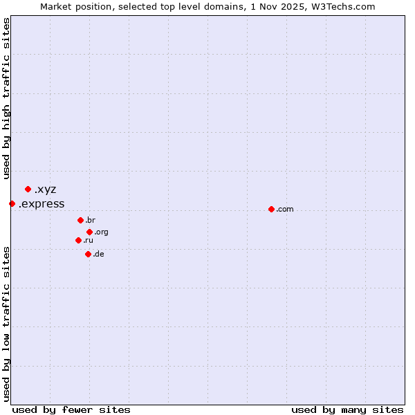 TechnologiesContent ManagementServer-side Languages Client-side Languages JavaScript Libraries CSS Frameworks Web Servers Web Panels Operating Systems Web Hosting Data Centers Reverse Proxies DNS Servers Email Servers SSL Certificate Authorities Content Delivery Traffic Analysis Tools Advertising Networks Tag Managers Social Widgets Site Elements Structured Data Markup Languages Character Encodings Image File Formats Top Level Domains Server Locations Content Languages ComparisonCompare with other | Technologies > Top Level Domains > Technology usage comparison Comparison of the usage statistics of .xyz (XYZ) vs. .express (Express) for websitesThis report shows the usage statistics of .xyz (XYZ) vs. .express (Express) as top level domain on the web. See technologies overview for explanations on the methodologies used in the surveys. Our reports are updated daily. UsageThis diagram shows the percentages of websites using the selected technologies. How to read the diagram: