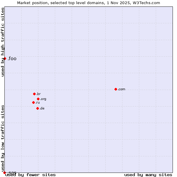 TechnologiesContent ManagementServer-side Languages Client-side Languages JavaScript Libraries CSS Frameworks Web Servers Web Panels Operating Systems Web Hosting Data Centers Reverse Proxies DNS Servers Email Servers SSL Certificate Authorities Content Delivery Traffic Analysis Tools Advertising Networks Tag Managers Social Widgets Site Elements Structured Data Markup Languages Character Encodings Image File Formats Top Level Domains Server Locations Content Languages ComparisonCompare with other | Technologies > Top Level Domains > Technology usage comparison Comparison of the usage statistics of .foo (Foo, used for prototyping and beta sites) vs. .sas (SAS Institute brand) for websitesThis report shows the usage statistics of .foo (Foo, used for prototyping and beta sites) vs. .sas (SAS Institute brand) as top level domain on the web. See technologies overview for explanations on the methodologies used in the surveys. Our reports are updated daily. UsageThis diagram shows the percentages of websites using the selected technologies. How to read the diagram: