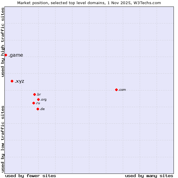 TechnologiesContent ManagementServer-side Languages Client-side Languages JavaScript Libraries CSS Frameworks Web Servers Web Panels Operating Systems Web Hosting Data Centers Reverse Proxies DNS Servers Email Servers SSL Certificate Authorities Content Delivery Traffic Analysis Tools Advertising Networks Tag Managers Social Widgets Site Elements Structured Data Markup Languages Character Encodings Image File Formats Top Level Domains Server Locations Content Languages ComparisonCompare with other | Technologies > Top Level Domains > Technology usage comparison Comparison of the usage statistics of .xyz (XYZ) vs. .game (Game) for websitesThis report shows the usage statistics of .xyz (XYZ) vs. .game (Game) as top level domain on the web. See technologies overview for explanations on the methodologies used in the surveys. Our reports are updated daily. UsageThis diagram shows the percentages of websites using the selected technologies. How to read the diagram: