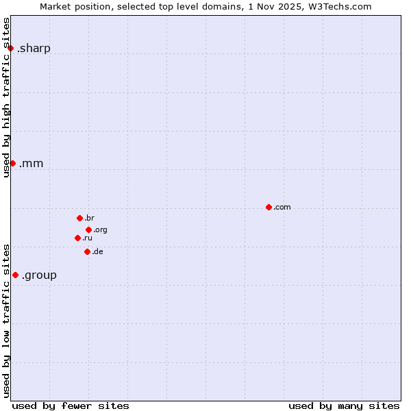 TechnologiesContent ManagementServer-side Languages Client-side Languages JavaScript Libraries CSS Frameworks Web Servers Web Panels Operating Systems Web Hosting Data Centers Reverse Proxies DNS Servers Email Servers SSL Certificate Authorities Content Delivery Traffic Analysis Tools Advertising Networks Tag Managers Social Widgets Site Elements Structured Data Markup Languages Character Encodings Image File Formats Top Level Domains Server Locations Content Languages | Technologies > Top Level Domains > Technology usage comparison Comparison of the usage statistics of .group (Group) vs. .mm (Myanmar) vs. .sharp (Sharp brand) for websitesThis report shows the usage statistics of .group (Group) vs. .mm (Myanmar) vs. .sharp (Sharp brand) as top level domain on the web. See technologies overview for explanations on the methodologies used in the surveys. Our reports are updated daily. UsageThis diagram shows the percentages of websites using the selected technologies. How to read the diagram: