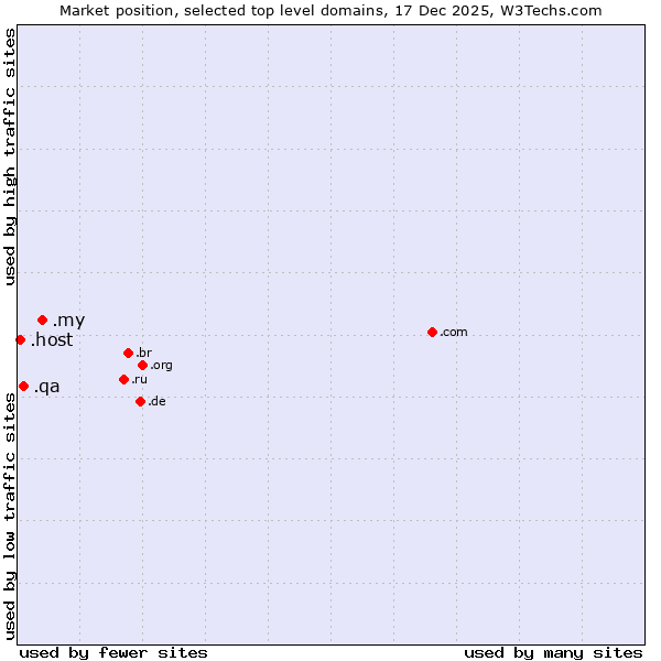 TechnologiesContent ManagementServer-side Languages Client-side Languages JavaScript Libraries CSS Frameworks Web Servers Web Panels Operating Systems Web Hosting Data Centers Reverse Proxies DNS Servers Email Servers SSL Certificate Authorities Content Delivery Traffic Analysis Tools Advertising Networks Tag Managers Social Widgets Site Elements Structured Data Markup Languages Character Encodings Image File Formats Top Level Domains Server Locations Content Languages | Technologies > Top Level Domains > Technology usage comparison Comparison of the usage statistics of .my (Malaysia) vs. .qa (Qatar) vs. .host (Hosting industry) for websitesThis report shows the usage statistics of .my (Malaysia) vs. .qa (Qatar) vs. .host (Hosting industry) as top level domain on the web. See technologies overview for explanations on the methodologies used in the surveys. Our reports are updated daily. UsageThis diagram shows the percentages of websites using the selected technologies. How to read the diagram:
