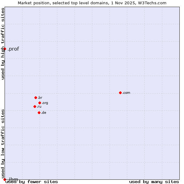 TechnologiesContent ManagementServer-side Languages Client-side Languages JavaScript Libraries CSS Frameworks Web Servers Web Panels Operating Systems Web Hosting Data Centers Reverse Proxies DNS Servers Email Servers SSL Certificate Authorities Content Delivery Traffic Analysis Tools Advertising Networks Tag Managers Social Widgets Site Elements Structured Data Markup Languages Character Encodings Image File Formats Top Level Domains Server Locations Content Languages ComparisonCompare with other | Technologies > Top Level Domains > Technology usage comparison Comparison of the usage statistics of .prof (Short for professor) vs. .ibm (IBM brand) for websitesThis report shows the usage statistics of .prof (Short for professor) vs. .ibm (IBM brand) as top level domain on the web. See technologies overview for explanations on the methodologies used in the surveys. Our reports are updated daily. UsageThis diagram shows the percentages of websites using the selected technologies. How to read the diagram: