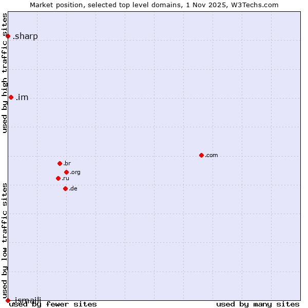 TechnologiesContent ManagementServer-side Languages Client-side Languages JavaScript Libraries CSS Frameworks Web Servers Web Panels Operating Systems Web Hosting Data Centers Reverse Proxies DNS Servers Email Servers SSL Certificate Authorities Content Delivery Traffic Analysis Tools Advertising Networks Tag Managers Social Widgets Site Elements Structured Data Markup Languages Character Encodings Image File Formats Top Level Domains Server Locations Content Languages | Technologies > Top Level Domains > Technology usage comparison Comparison of the usage statistics of .im (Isle of Man) vs. .sharp (Sharp brand) vs. .ismaili (Shia Ismaili Muslim community) for websitesThis report shows the usage statistics of .im (Isle of Man) vs. .sharp (Sharp brand) vs. .ismaili (Shia Ismaili Muslim community) as top level domain on the web. See technologies overview for explanations on the methodologies used in the surveys. Our reports are updated daily. UsageThis diagram shows the percentages of websites using the selected technologies. How to read the diagram: