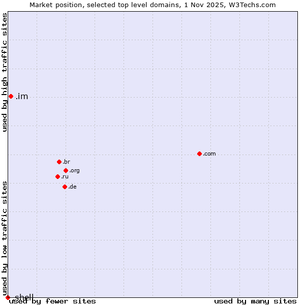 TechnologiesContent ManagementServer-side Languages Client-side Languages JavaScript Libraries CSS Frameworks Web Servers Web Panels Operating Systems Web Hosting Data Centers Reverse Proxies DNS Servers Email Servers SSL Certificate Authorities Content Delivery Traffic Analysis Tools Advertising Networks Tag Managers Social Widgets Site Elements Structured Data Markup Languages Character Encodings Image File Formats Top Level Domains Server Locations Content Languages ComparisonCompare with other | Technologies > Top Level Domains > Technology usage comparison Comparison of the usage statistics of .im (Isle of Man) vs. .shell (Shell brand) for websitesThis report shows the usage statistics of .im (Isle of Man) vs. .shell (Shell brand) as top level domain on the web. See technologies overview for explanations on the methodologies used in the surveys. Our reports are updated daily. UsageThis diagram shows the percentages of websites using the selected technologies. How to read the diagram: